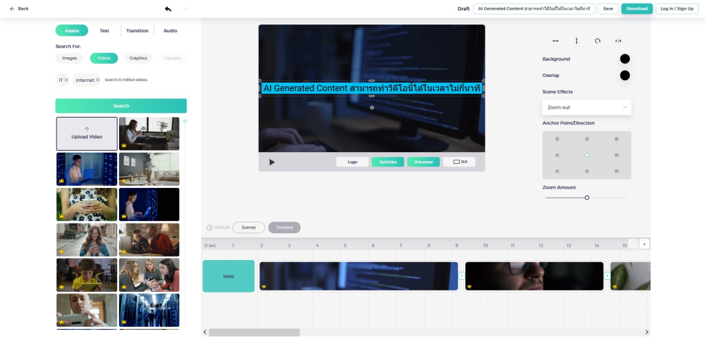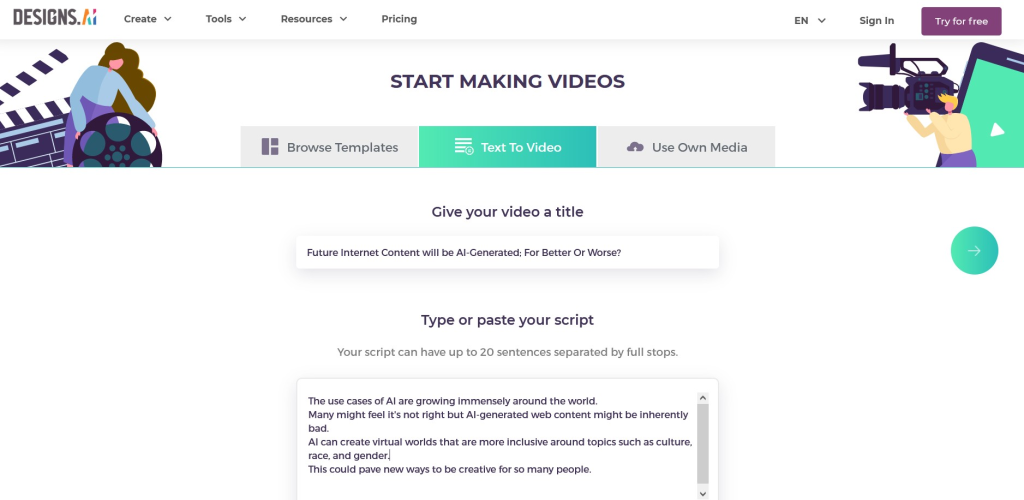 DESIGNS.AI เป็นเครื่องมือช่วยในการตัดต่อวิดีโอ ที่เริ่มจากการเขียนสคริปต์วิดีโอ ที่มีหัวข้อ และเนื้อหาแต่ละช่วงของวิดีโอที่ต้องการอธิบาย (รองรับภาษาไทย) แล้วโปรแกรมจะทำการค้นหาภาพ วิดีโอ แบบอักษร เสียงเพลง หรือแม้กระทั่งสร้างเสียงพากย์ ร้อยเรียงเป็น timeline ออกมาให้