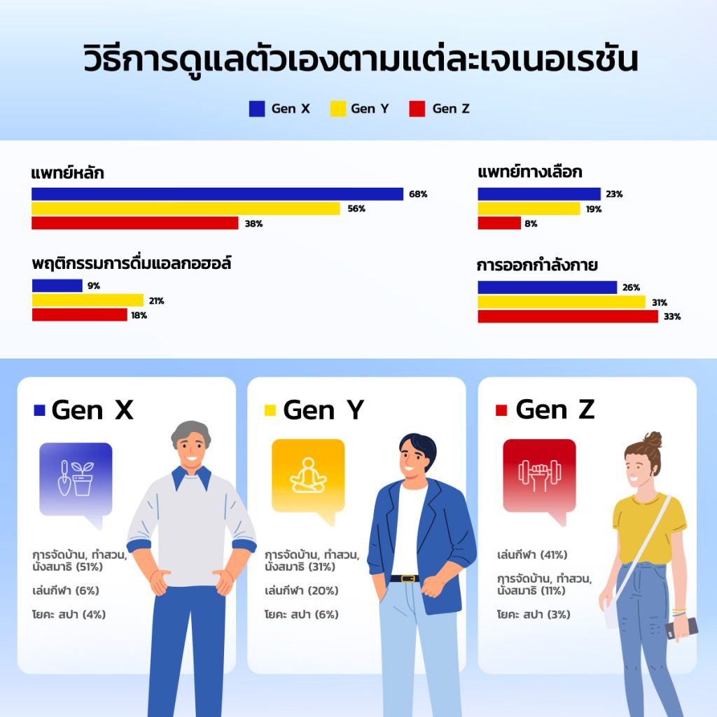 นอกจากนี้ ด้วยภาระหน้าที่ความรับผิดชอบที่เพิ่มขึ้นในฐานะผู้นำของครอบครัวทำให้ คน Gen X มีเวลาที่จำกัด ส่งผลให้คน Gen X ใช้เวลาออกกำลังกายได้น้อยลง โดยคน Gen X กว่า 51% จะเลือกใช้เวลาว่างส่วนใหญ่ไปกับการพักผ่อนและทำกิจกรรมที่บ้าน เช่น จัดบ้าน ทำสวน และ นั่งสมาธิ ต่างจากคน Gen Y และ Gen Z ที่สนใจในกิจกรรมดังกล่าวเพียง 31% และ 11% ตามลำดับ ยิ่งไปกว่านั้น คน Gen X กว่า 23% เลือกดูแลสุขภาพด้วยวิธี การนวดหรือการใช้สมุนไพรจากแพทย์ทางเลือก เข้ามาเสริมในการดูแลสุขภาพ ต่างจากคนเจนเนเรชั่น อื่นๆ เช่น Gen Y 19% และ Gen Z 8% จากข้อมูลดังกล่าว สะท้อนให้เห็นว่า การสื่อสารการตลาดเพื่อให้เข้าถึงคน Gen X ธุรกิจต้องคำนึงถึงการตอกย้ำความมั่นใจด้วยภาพลักษณ์สินค้าหรือบริการที่มุ่งเน้นคุณสมบัติด้านผ่อนคลาย สงบ เสริมสร้างสุขภาพกาย สุขภาพใจ ให้แข็งแกร่งยกระดับคุณภาพชีวิตที่ดี