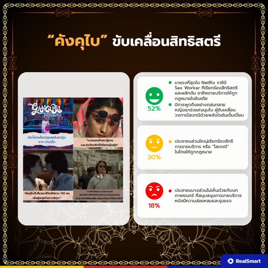 พบความคิดเห็นเชิงบวก (Positive Sentiment) 52% เป็นภาพยนตร์ที่มาแรงที่สุดใน Netflix คังคุไบ ราชินี Sex Worker หญิงแกร่งแห่งมุมไบที่ออกมาเรียกร้องสิทธิสตรี และผลักดันอาชีพขายบริการให้ถูกกฎหมายในอินเดีย