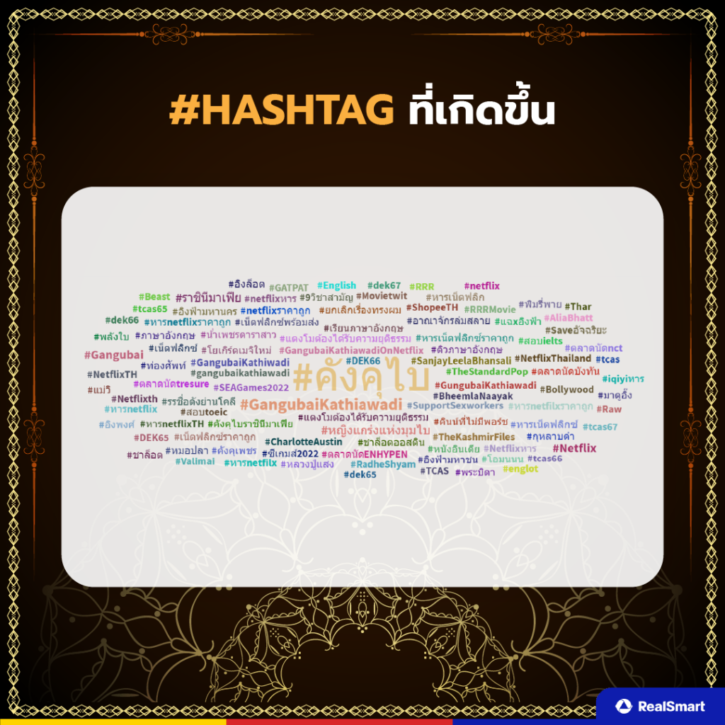 Top #Hashtag ที่เกิดขึ้นเกี่ยวกับประเด็นภาพยนตร์คังคุไบในครั้งนี้มีอยู่มากมาย แต่ที่เห็นได้ชัดเจนจะเป็นทั้งภาษาไทยและภาษาอังกฤษ #คังคุไบ #GangubaiKathiawadi และอื่น ๆ หากใครสนใจสามารถไปตามดูใน Hashtag เกิดขึ้นได้เช่นกัน