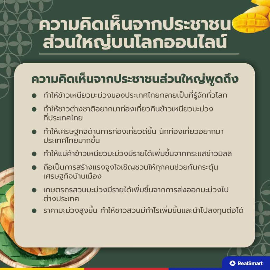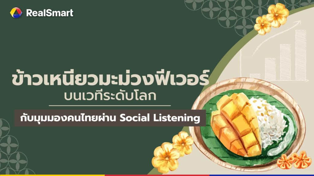 Real Smart ได้รวบรวมข้อมูลกระแสข้าวเหนียวมะม่วงผ่าน Social Listening ทั้งในส่วนของความคิดเห็น ความรู้สึก มุมมองต่าง ๆ ที่เกิดขึ้นจากคนไทยในโลกออนไลน์ทั้งหมดออกมาให้ทุกคนได้อ่านกัน