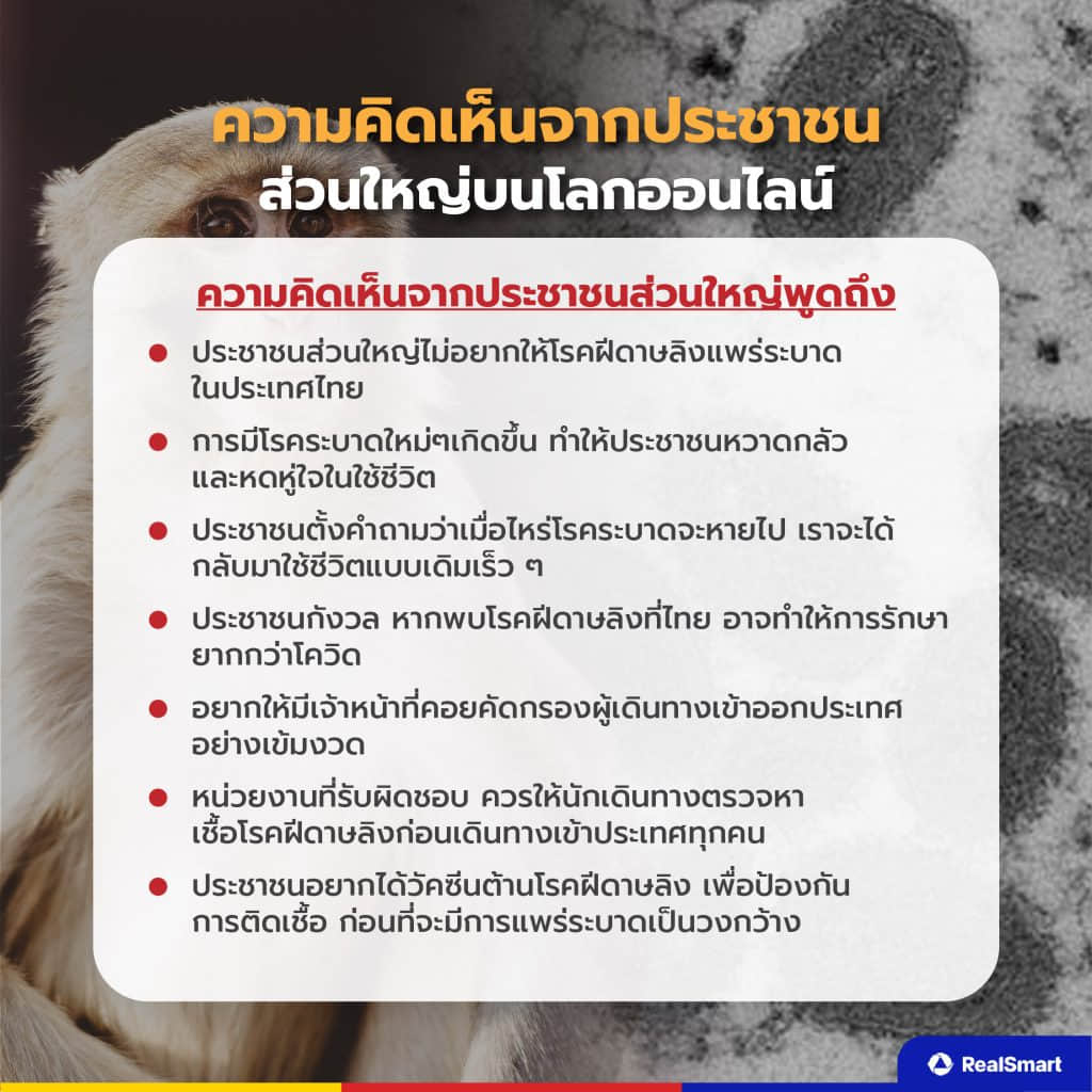 ในส่วนของความคิดเห็นของคนไทยในโลกออนไลน์ส่วนใหญ่ไปในทิศทางเดียวกันเกือบทั้งหมด ซึ่งเกือบทุกคนบอกว่าไม่อยากให้โรคฝีดาษลิงเข้ามาแพร่เชื้อในประเทศไทย อยากให้เจ้าหน้าที่คอยคัดกรองผู้เดินทางเข้าออกประเทศอย่างเข้มงวด และมีอีกหลายคนวิตกกังวล หวาดกลัว และหดหู่ใจในการใช้ชีวิตท่ามกลางการแพร่ระบาดของโรคใหม่ ๆ รวมถึงอยากให้ประชาชนได้รับวัคซีนต้านโรคฝีดาษลิง เพื่อป้องกันการติดเชื้อไว้ก่อน