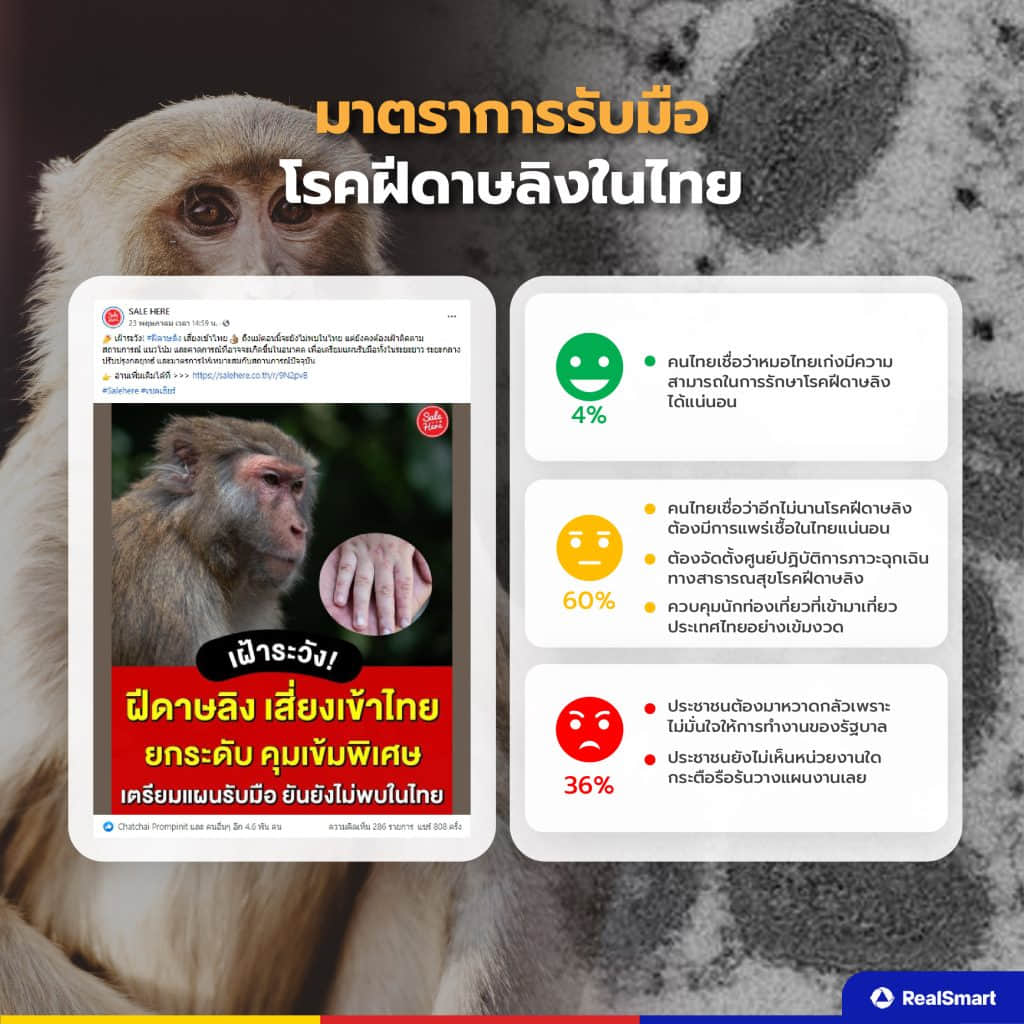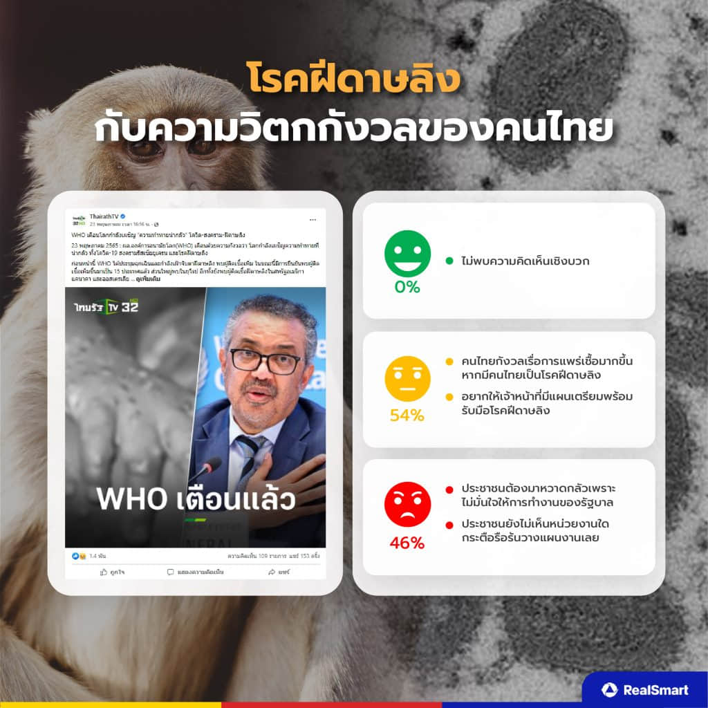 Real Smart จึงได้เก็บรวบรวมข้อมูลในส่วนของความคิดเห็น ความรู้สึก ประเด็นที่คนให้ความสนใจ และอื่น ๆ ผ่าน Social Listening ในเรื่องความกังวลของคนไทยกับโรคฝีดาษลิง มาเล่าให้ทุกคนได้เข้าใจว่ามุมมองของคนไทยเป็นอย่างไร มาเริ่มกันเลย