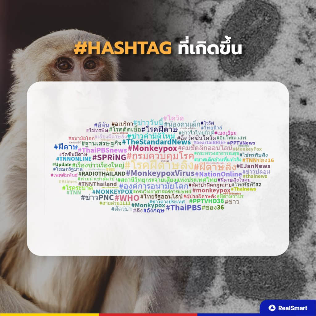 Top #Hashtag ที่เกิดขึ้นเกี่ยวกับประเด็นโรคฝีดาษลิงนั้นมีอยู่มากมาย แต่ที่เห็นได้ชัดเจนที่เป็นภาษาไทย #กรมควบคุมโรค #โรคฝีดาษลิง #ฝีดาษลิง และอื่น ๆ หากใครสนใจสามารถไปตามดูใน Hashtag เกิดขึ้นได้เช่นกัน