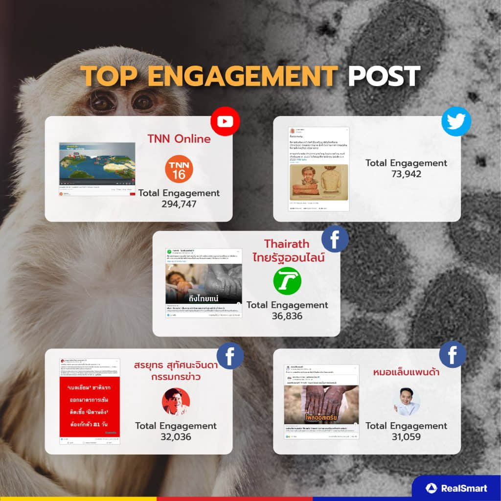 พบว่า Top Engagement เกี่ยวกับโรคฝีดาษลิงนั้นส่วนใหญ่จะเกิดขึ้นช่องทาง Facebook YouTube และ Twitter ที่แต่ละแพลตฟอร์มจะมีความแตกต่างกันอยู่บาง ในส่วนของช่องทาง Facebook ที่ได้รับ Engagement สูงนั้นเป็นนักข่าว สำนักข่าว และคนดังที่ดูน่าเชื่อถือในด้านนี้