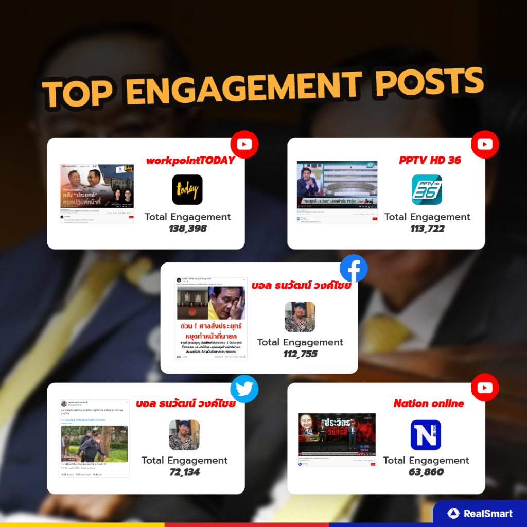 ในส่วนของ Top Engagement Post พบว่าช่องทาง YouTube ได้รับ engagement สูงสุดเนื่องจากเป็นนักข่าวชื่อดังระดับประเทศได้ออกมารายงานข่าวและติดตามสถานการณ์การเปลี่ยนแปลงครั้งนี้อย่างต่อเนื่อง ตามมาด้วย Twitter และ Facebook ที่ยังคงเป็นช่องทางที่คนนิยมติดตามสถานการณ์ต่าง ๆ ที่เกิดขึ้น