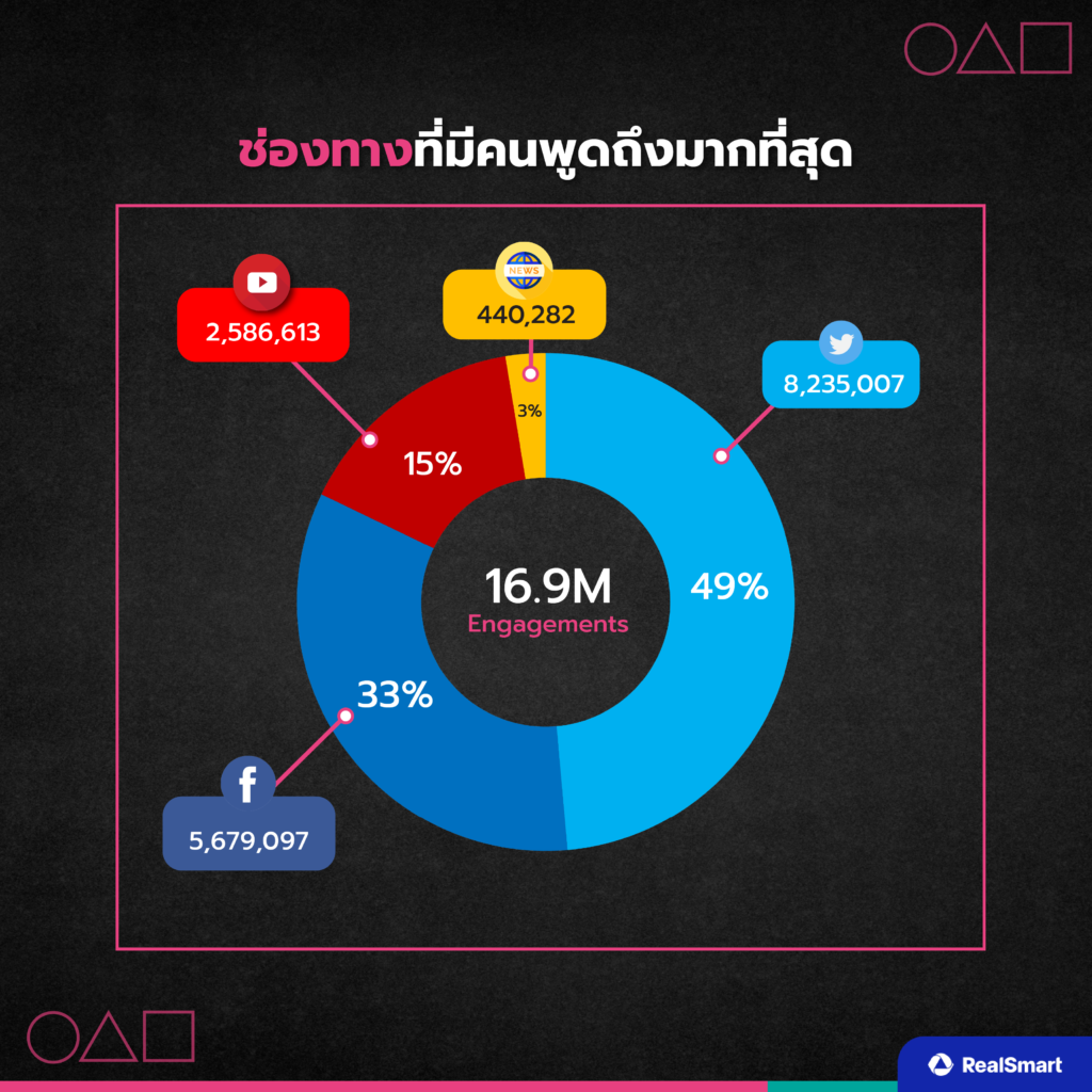 โดยรวมแล้วมี Engagement เกี่ยวกับซีรีส์เรื่องนี้รวมสูงถึง 16.9 ล้าน Engagements โดยที่ Twitter มีข้อความที่เกี่ยวข้องสูงสุด ถึง 8,235,007 Engagements หรือ 49% รองลงมาคือ Facebook อยู่ที่ 5,679,097 Engagements หรือ 33% ต่อมา คือ YouTube มีข้อความที่เกี่ยวข้อง 2,586,613 Engagements คิดเป็น 15% และสุดท้าย คือ News มีข้อความที่เกี่ยวข้อง 440,282 Engagements คิดเป็น 3%