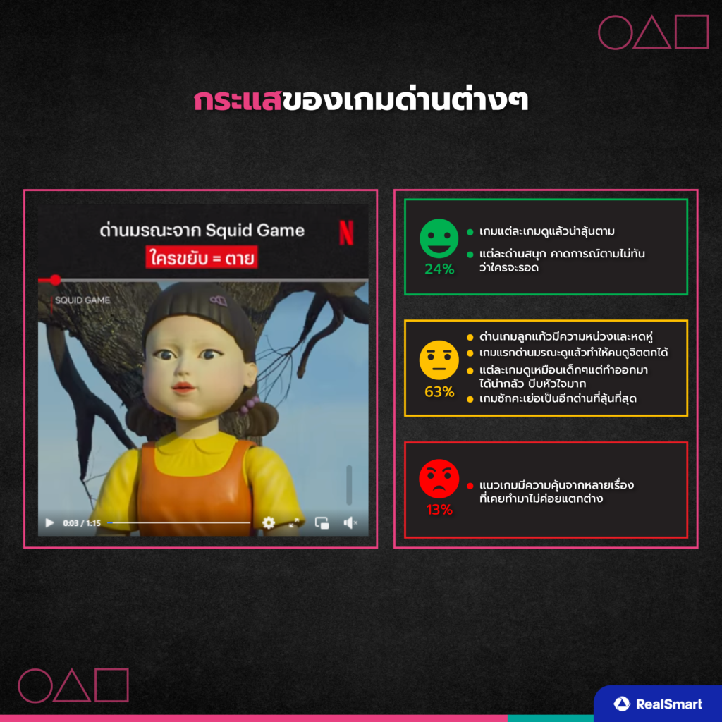 กระแสของเกมด่านต่างๆ มีคนออกมาแสดงความรู้สึกที่แตกต่างกันออกไป มีถึง 63% มองว่าเกมแรกด่านมรณะดูแล้วจิตตก ด่านลูกแก้วมีความหน่วง และหดหู่ รวมถึงเกมชักคะเย่อเป็นอีกด่านที่ลุ้นสุดๆ แล้วในแต่ละเกมดูเหมือนง่ายๆ แต่กลับทำออกมาได้น่ากลัว บีบหัวใจมาก และ 24% บอกว่าเกมแต่ละเกมดูแล้วลุ้นตาม คาดเดาอะไรไม่ได้เลย อีก 13% บอกว่าแนวเกมมีความคุ้นจากหลายเรื่อง รู้สึกไม่ค่อยแตกต่างเท่าไหร่