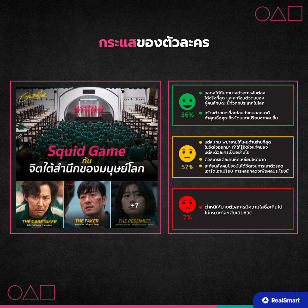 กระแสของตัวละครใน Squid Game มีคนออกมาแสดงความรู้สึกหลังจากดูซีรีส์เรื่องนี้แตกต่างกันออกไป โดยที่ 57% มองว่าแต่ละเกม พยายามให้เผยด้านร้ายของจิตใจออกมาว่าแต่ละตัวละครเป็นอย่างไร และยังสะท้อนสังคมปัจจุบันได้ชัดเจนถ้าอยู่ในสถานการณ์เอาตัวรอด เอารัดเอาเปรียบ การหลอกหลวงเพื่อผลประโยชน์ ส่วนอีก 36% มองว่านักแสดงแสดงออกมาได้ดีมาก และสะท้อนตัวตนของผู้คนในชีวิตจริงได้ และ 7% ออกมาตำหนิตัวละครบางตัวที่มีความใสซื่อเกินไป บางตัวก็ไม่ควรตกรอบ