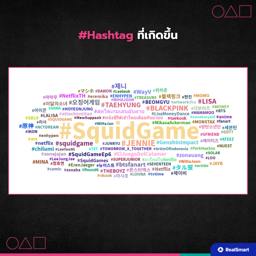 แฮชแท็กที่เกิดขึ้นเกี่ยวกับกระแสของซีรีส์ Squid Game ซึ่งมีจำนวนมากมายมหาศาล แต่ที่แฮชแท็กที่เกี่ยวข้องชัดเจน มีคำว่า #SquidGame #JENNIE #สควิดเกมเล่นลุ้นตาย และอื่นๆ